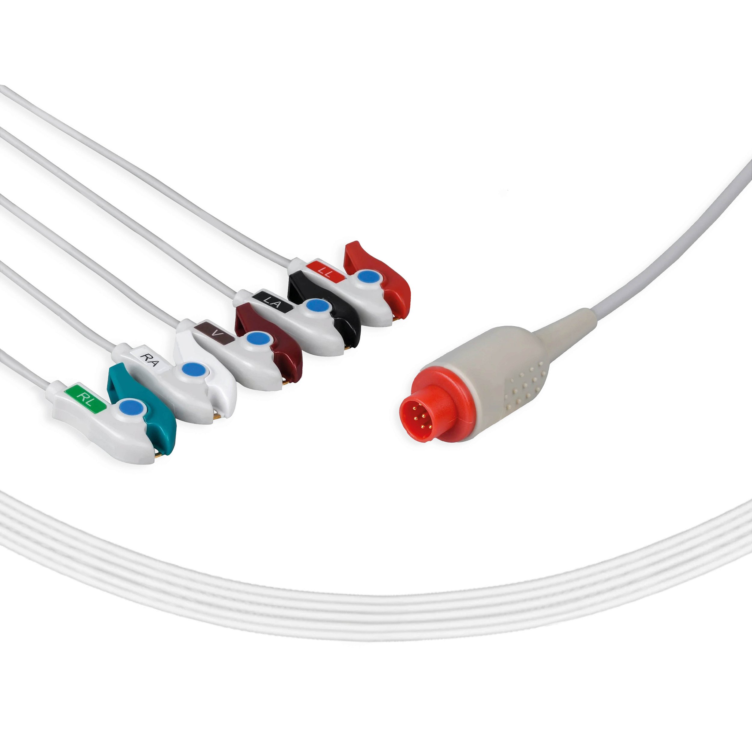 Cabo/eletrodo para monitoração de eletrocardiograma. Cabo de ECG com 5 vias destinados para uso em equipamentos, tipo cardioversores e monitores multiparamétricos, tendo como função monitorar as curvas de ECG e mensurar a frequência cardíaca dos pacientes.