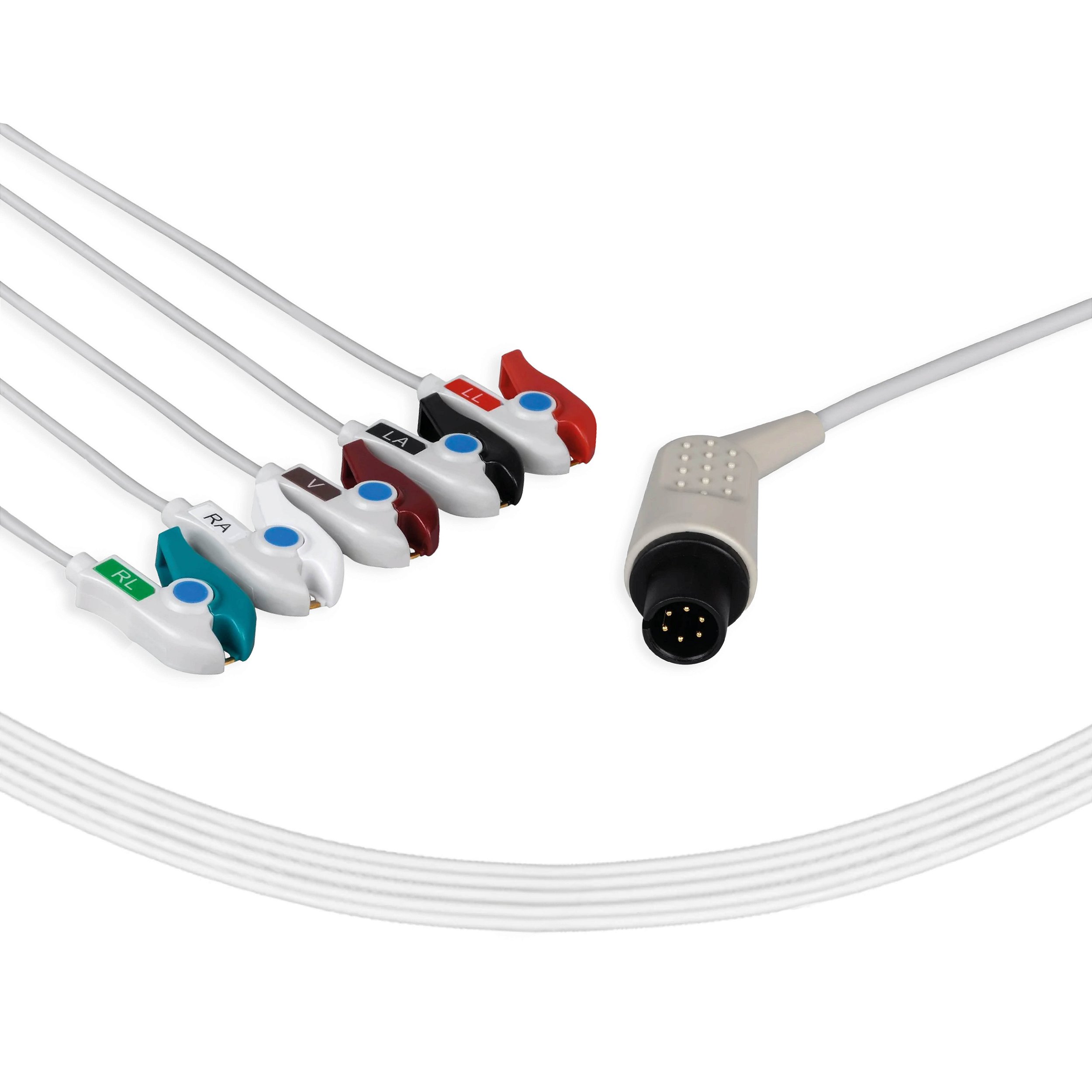 Cabo/eletrodo para monitoração de eletrocardiograma. Cabo de ECG com 5 vias destinados para uso em equipamentos, tipo cardioversores e monitores multiparamétricos, tendo como função monitorar as curvas de ECG e mensurar a frequência cardíaca dos pacientes.