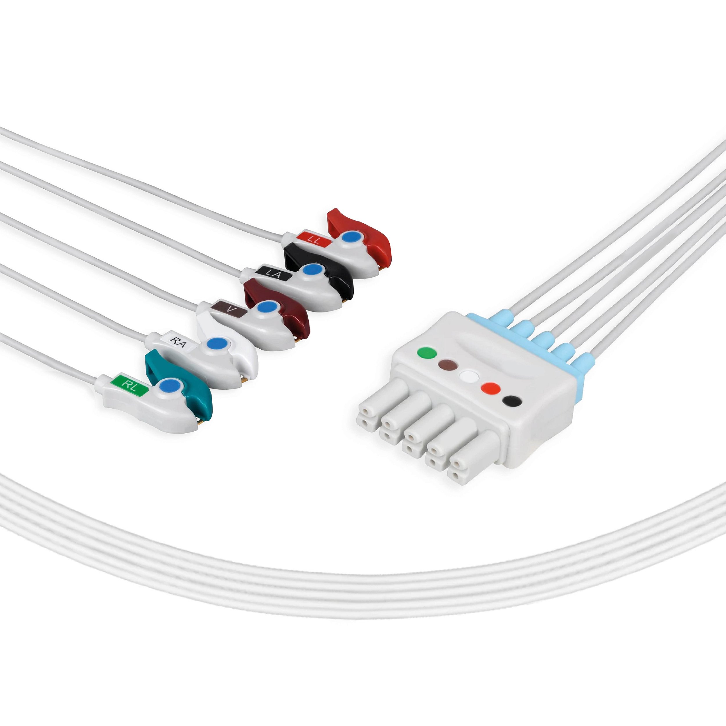 Cabo/eletrodo para monitoração de eletrocardiograma. Cabo de ECG com 5 vias destinados para uso em equipamentos, tipo cardioversores e monitores multiparamétricos, tendo como função monitorar as curvas de ECG e mensurar a frequência cardíaca dos pacientes.