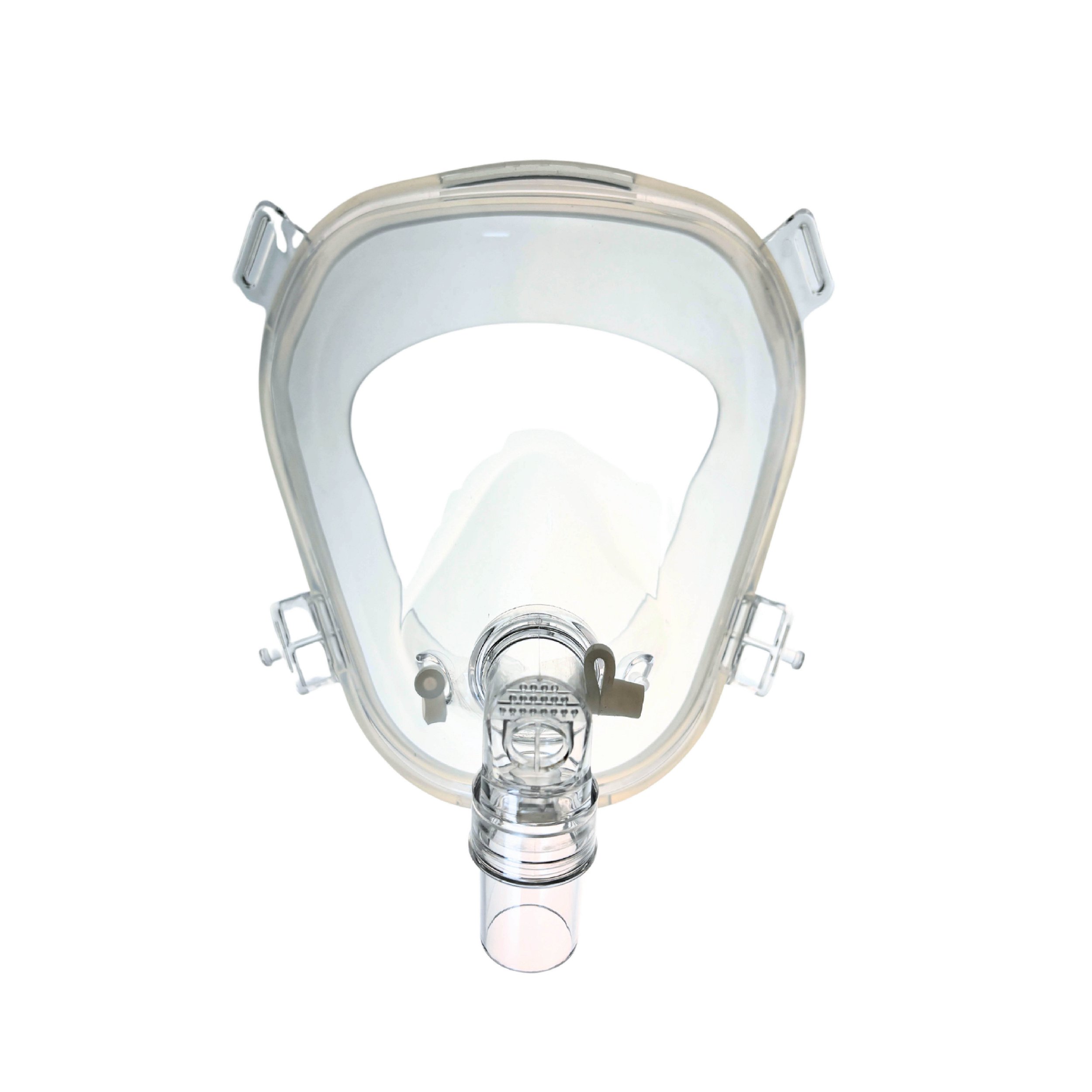 Máscara total face tamanho único, para pacientes adultos. Dispositivo fabricado em silicone, com cotovelo, clipe, armação e adaptador em PVC. Produto reutilizável, livre de látex, com conector OD: 22mm e cotovelo com exalação. Utilizado como acessório para de CPAP, BIPAP e ventiladores pulmonares. Registro ANVISA: 82205410005